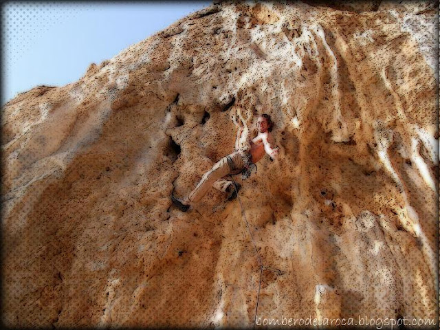 Empezamos por la muy sucia y rara El Choco loco (6b+), vía de tacto extraño y canto resbaloso con trozos llenos de tierra, poco recomendable en el estado en la que la encontramos nosotros.